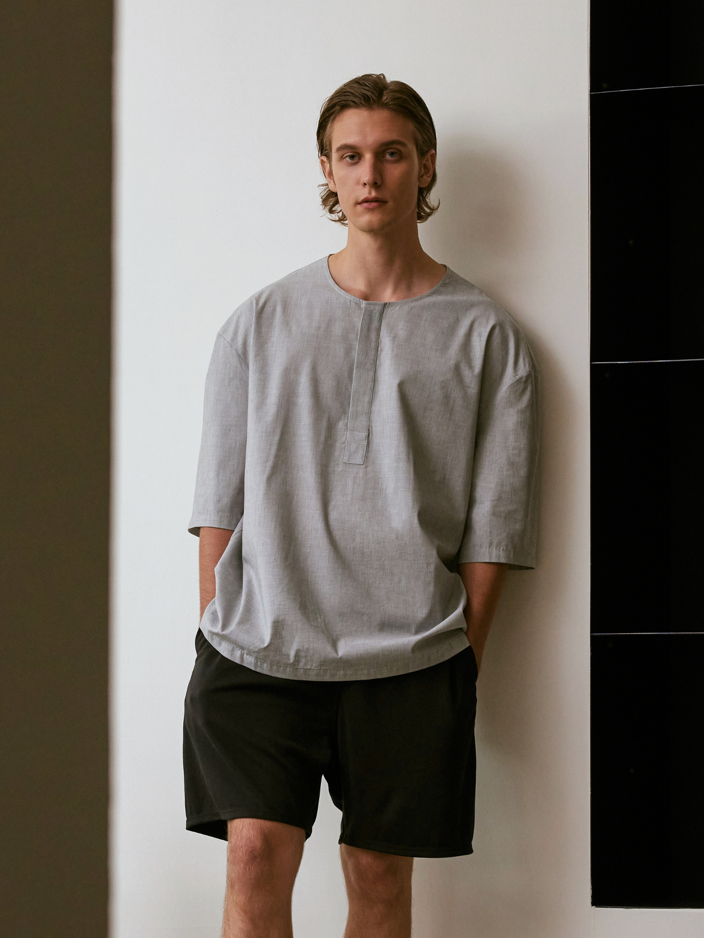 This top has a loose silhouette with a Henley neckline and natural shell button closures. Creating a refined and minimalist style within a casual aesthetic.