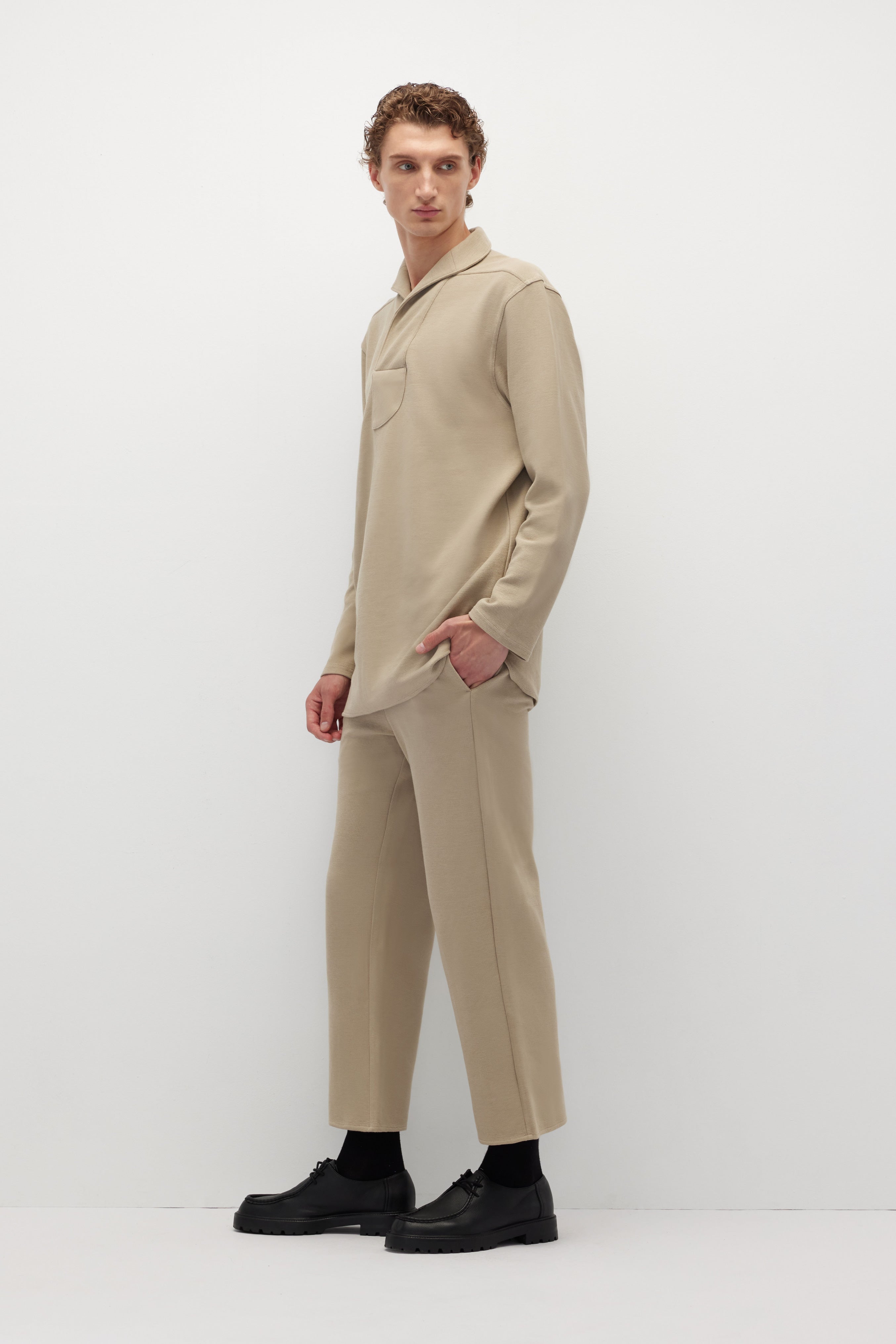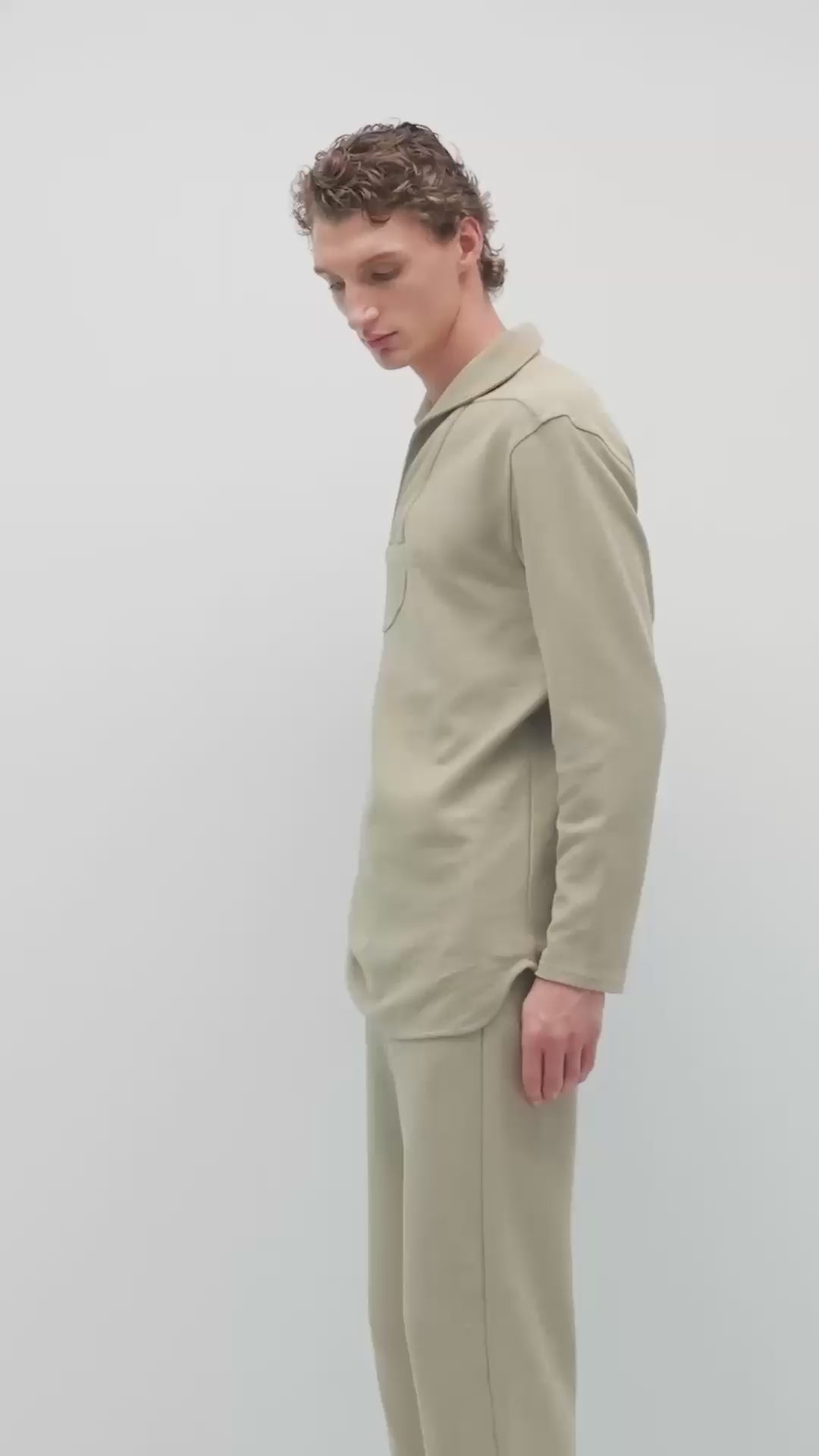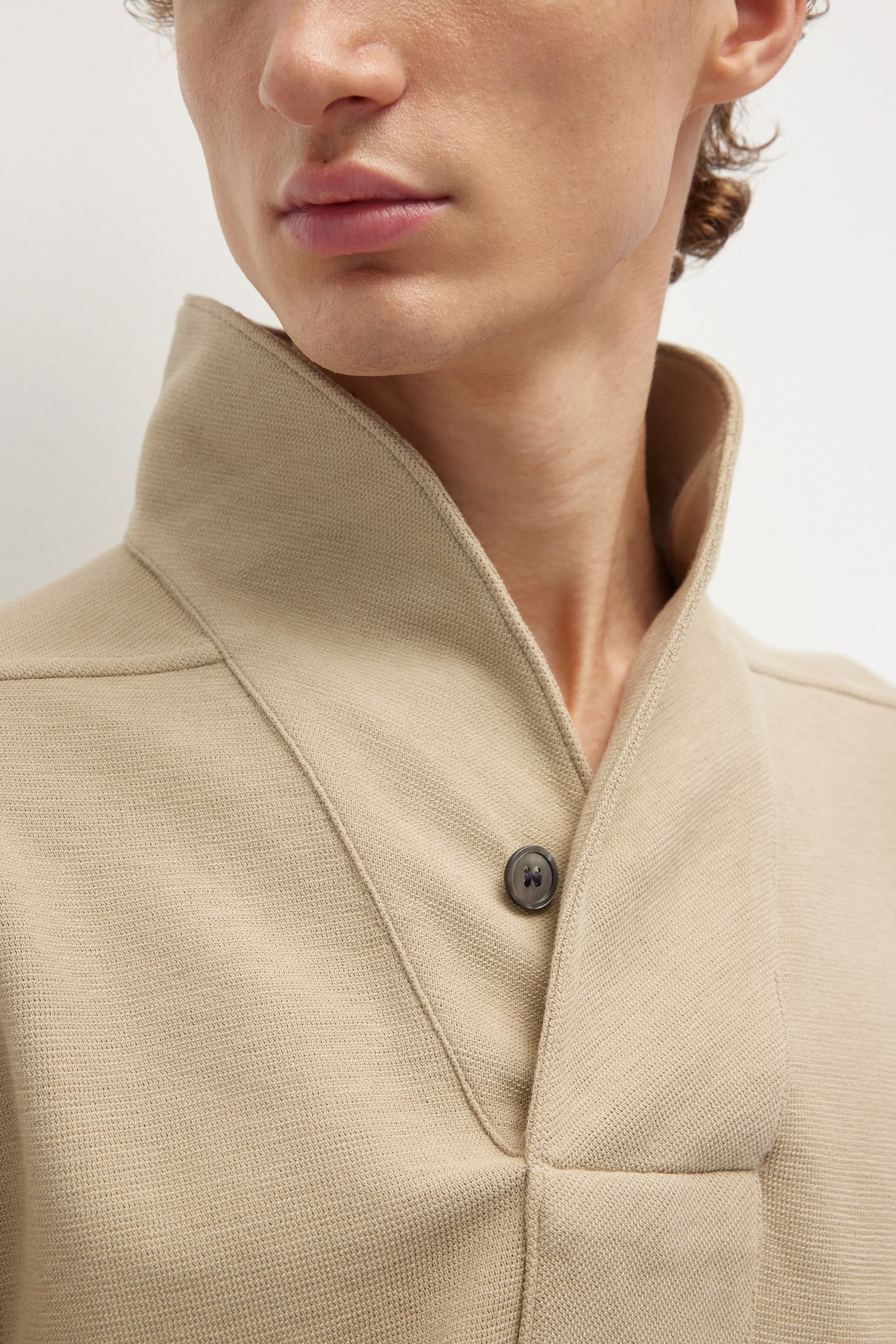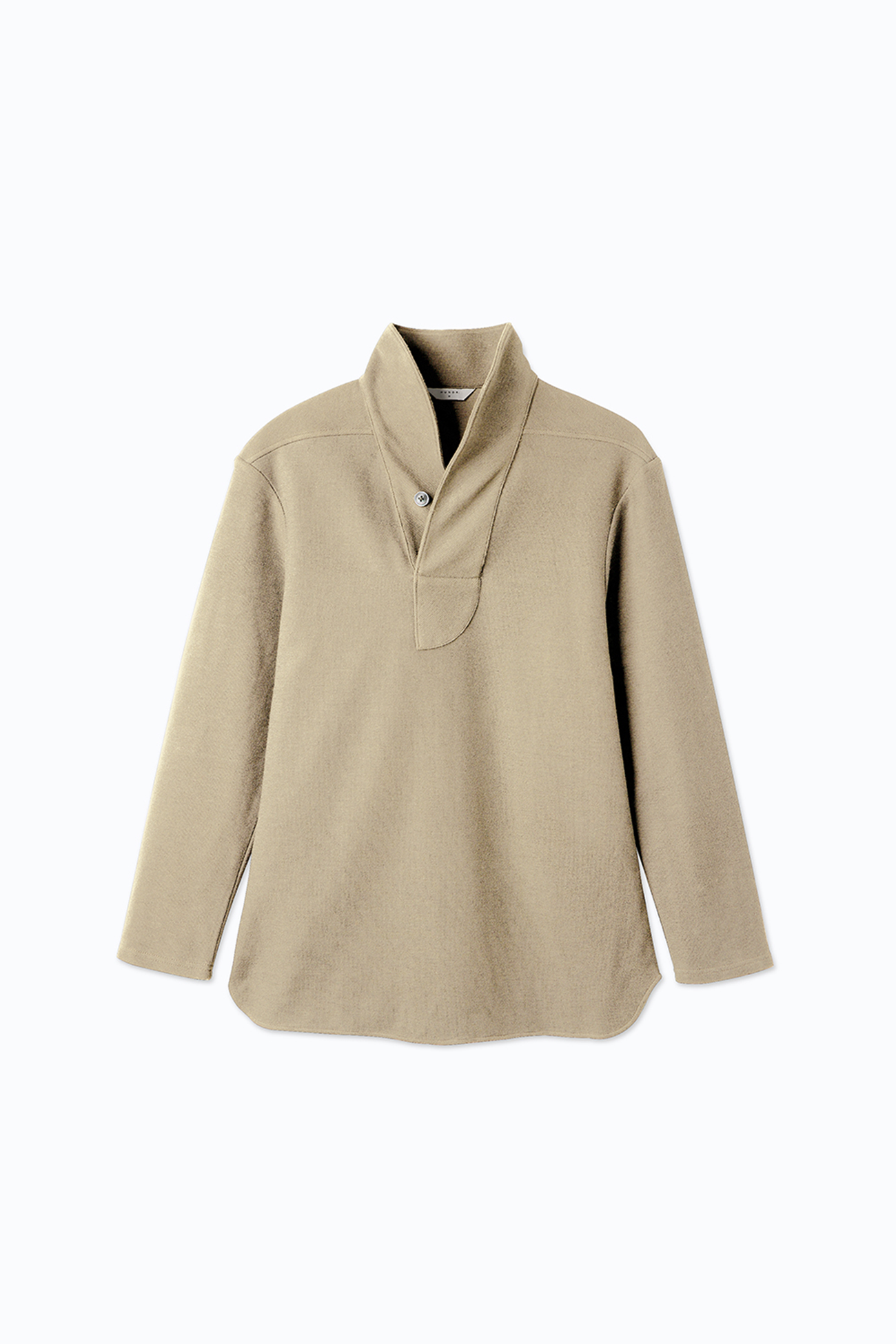 フィット感がありながらもゆったりとしたシルエットの半開襟トップスです。襟元にはオープンカラーを採用し、カジュアルな中にもフォーマルな雰囲気を演出します。また、スタンドカラーとしても着用でき、保温性が向上します。生地には純綿を使用し、立体的な織り模様が施され、自然で快適な肌触りを実現しています。同シリーズのプリーツパンツとのセットアップも可能です。