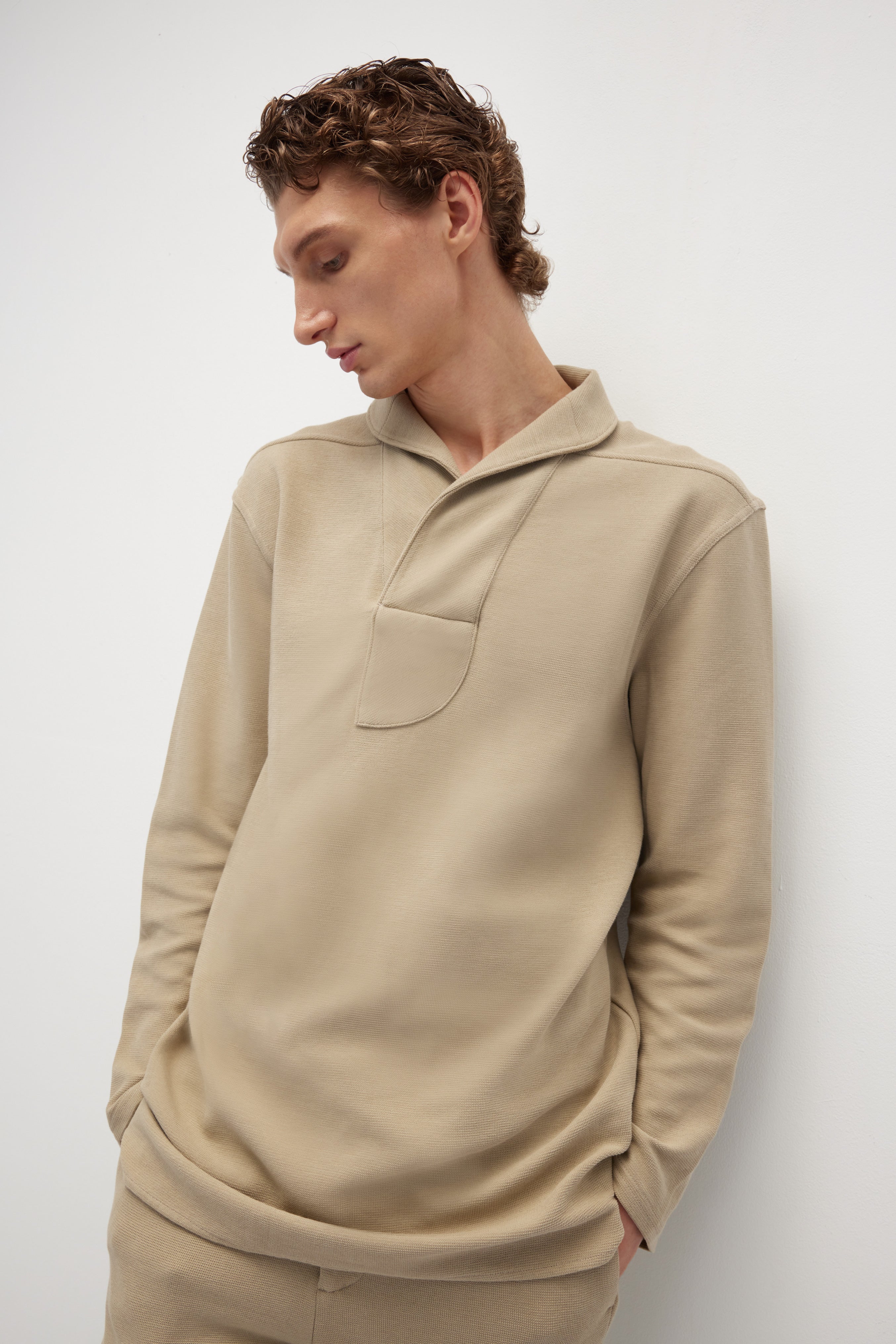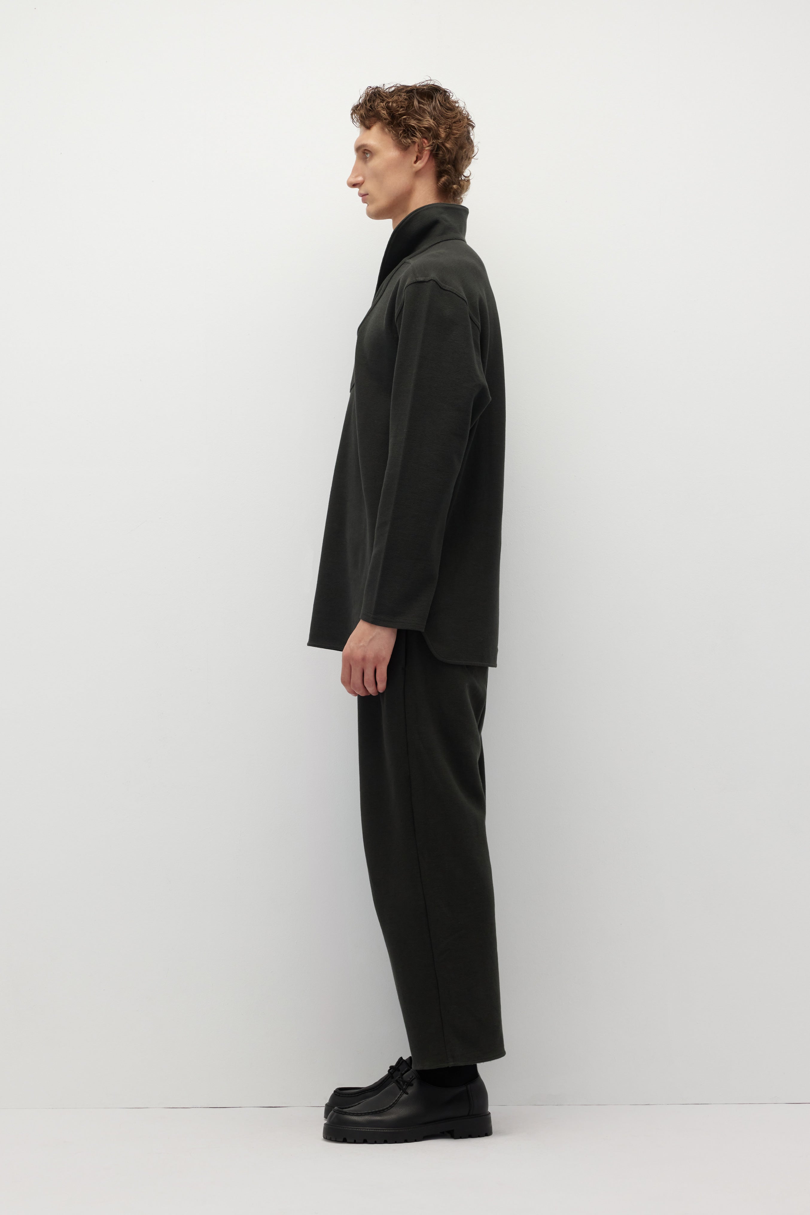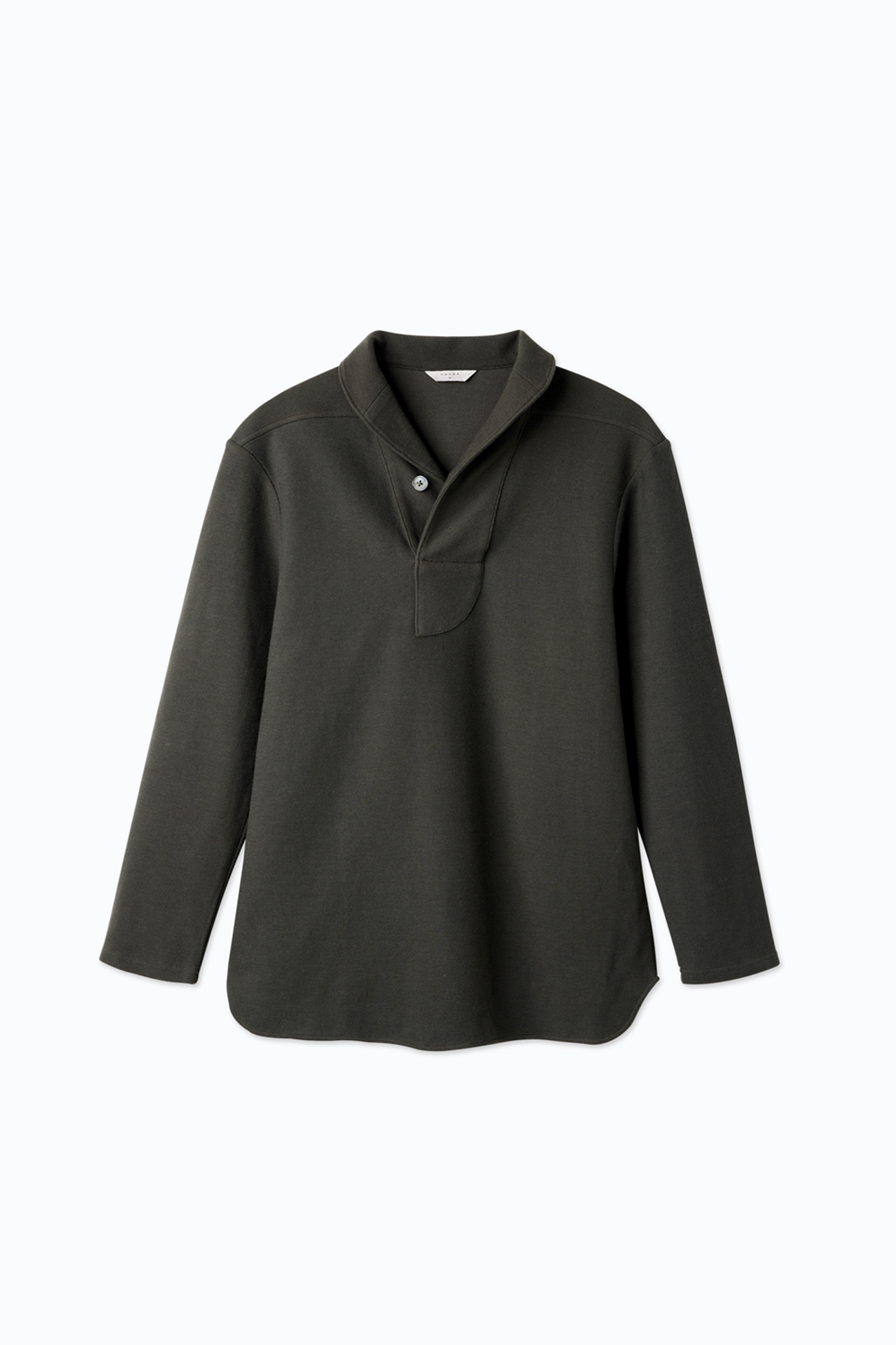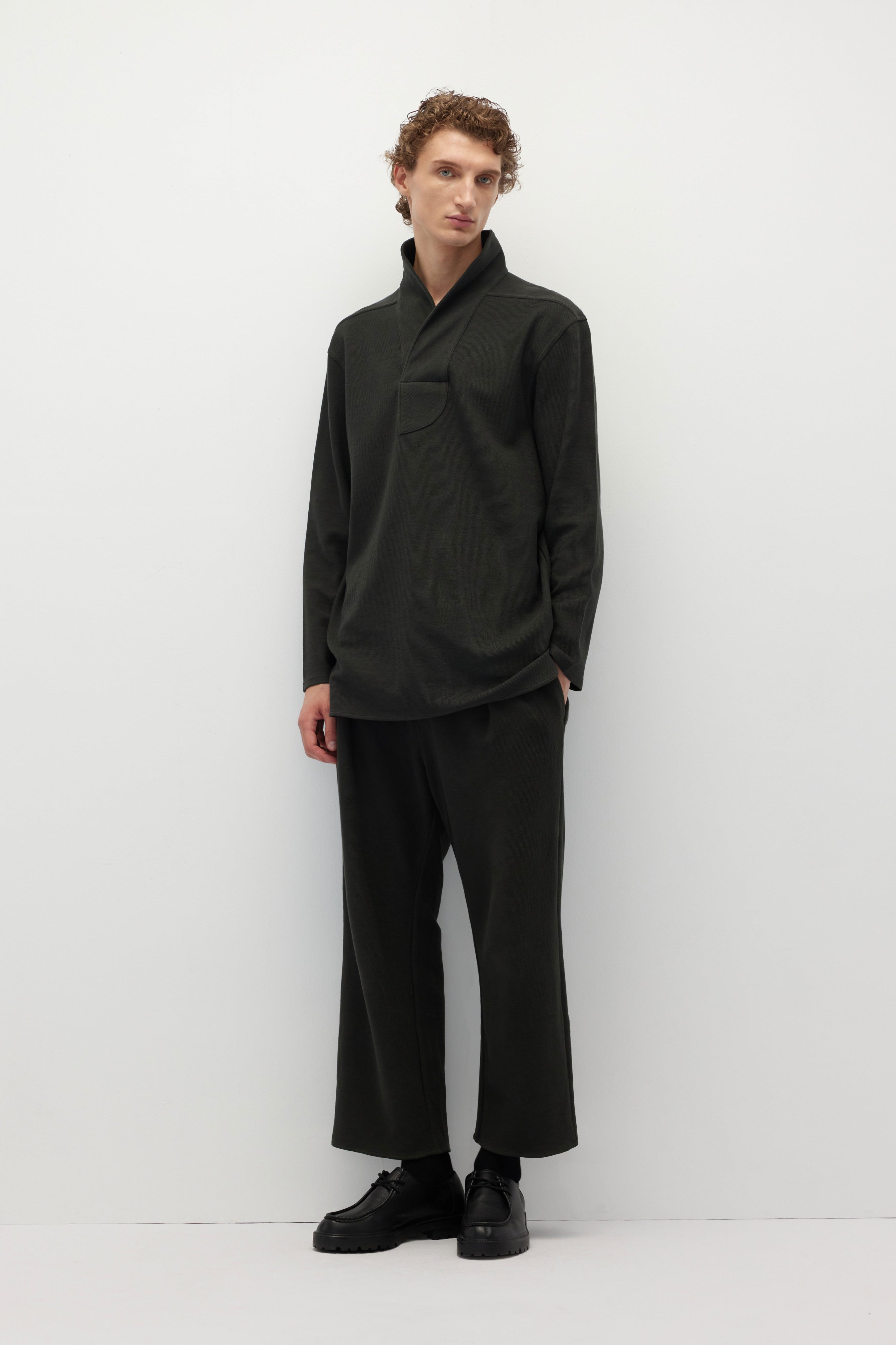 フィット感がありながらもゆったりとしたシルエットの半開襟トップスです。襟元にはオープンカラーを採用し、カジュアルな中にもフォーマルな雰囲気を演出します。また、スタンドカラーとしても着用でき、保温性が向上します。生地には純綿を使用し、立体的な織り模様が施され、自然で快適な肌触りを実現しています。同シリーズのプリーツパンツとのセットアップも可能です。