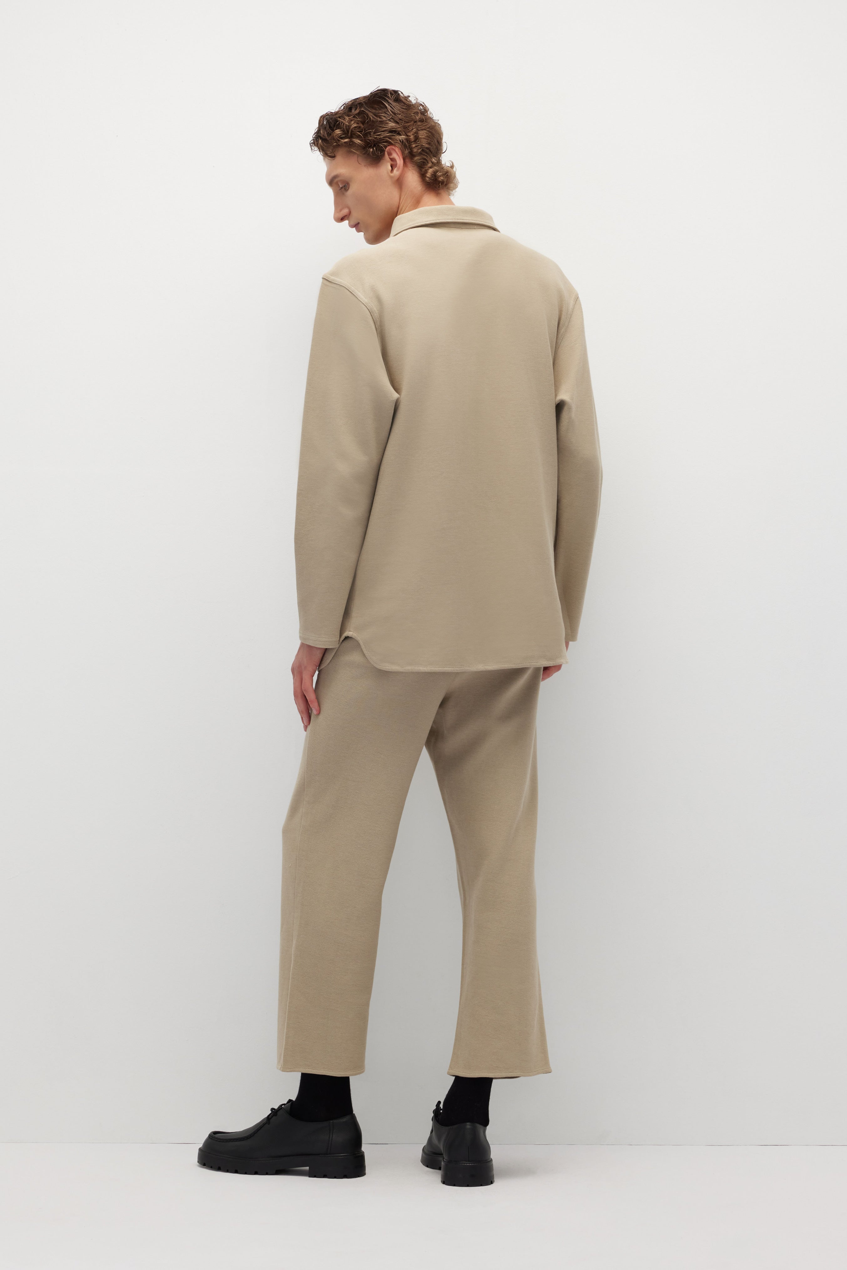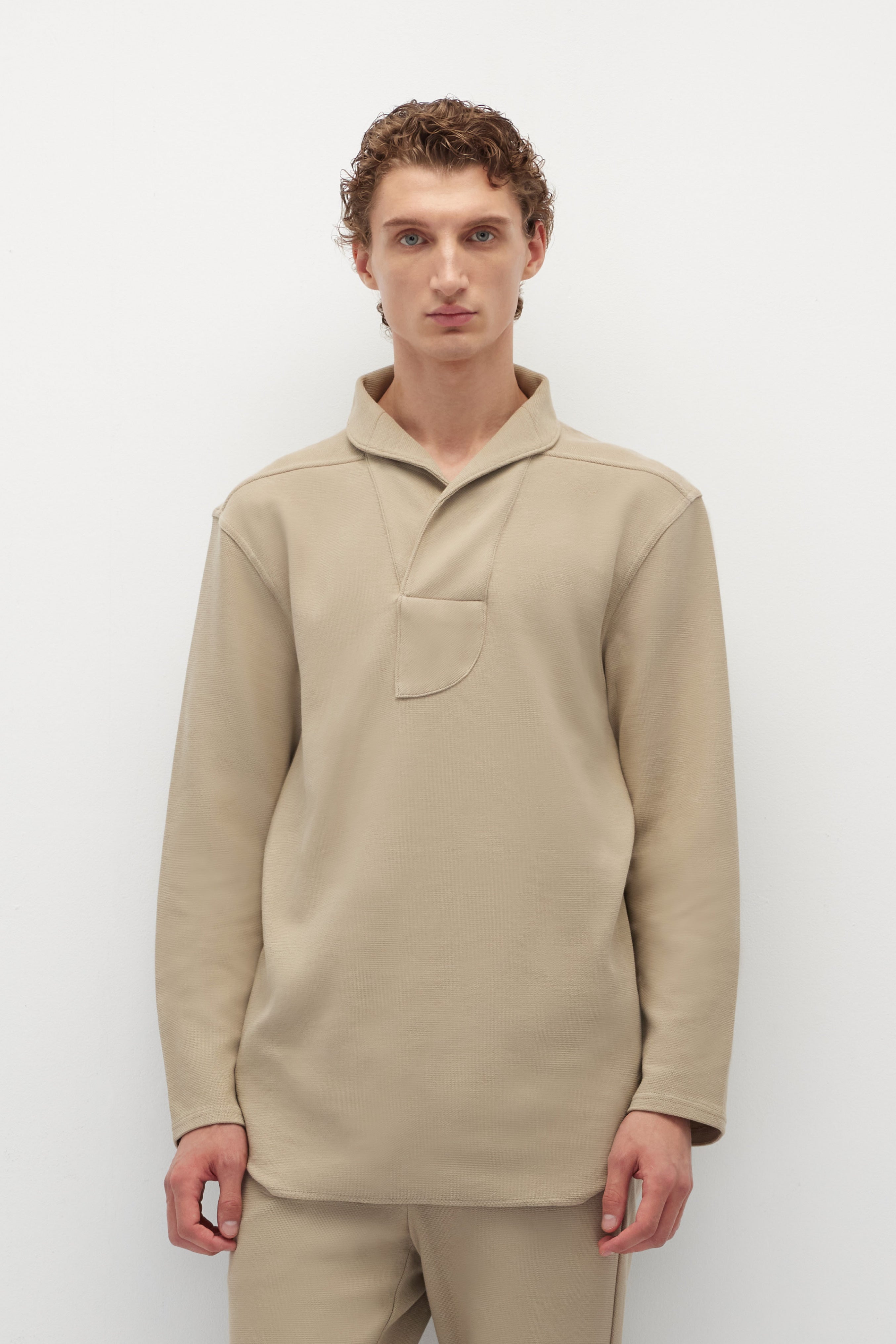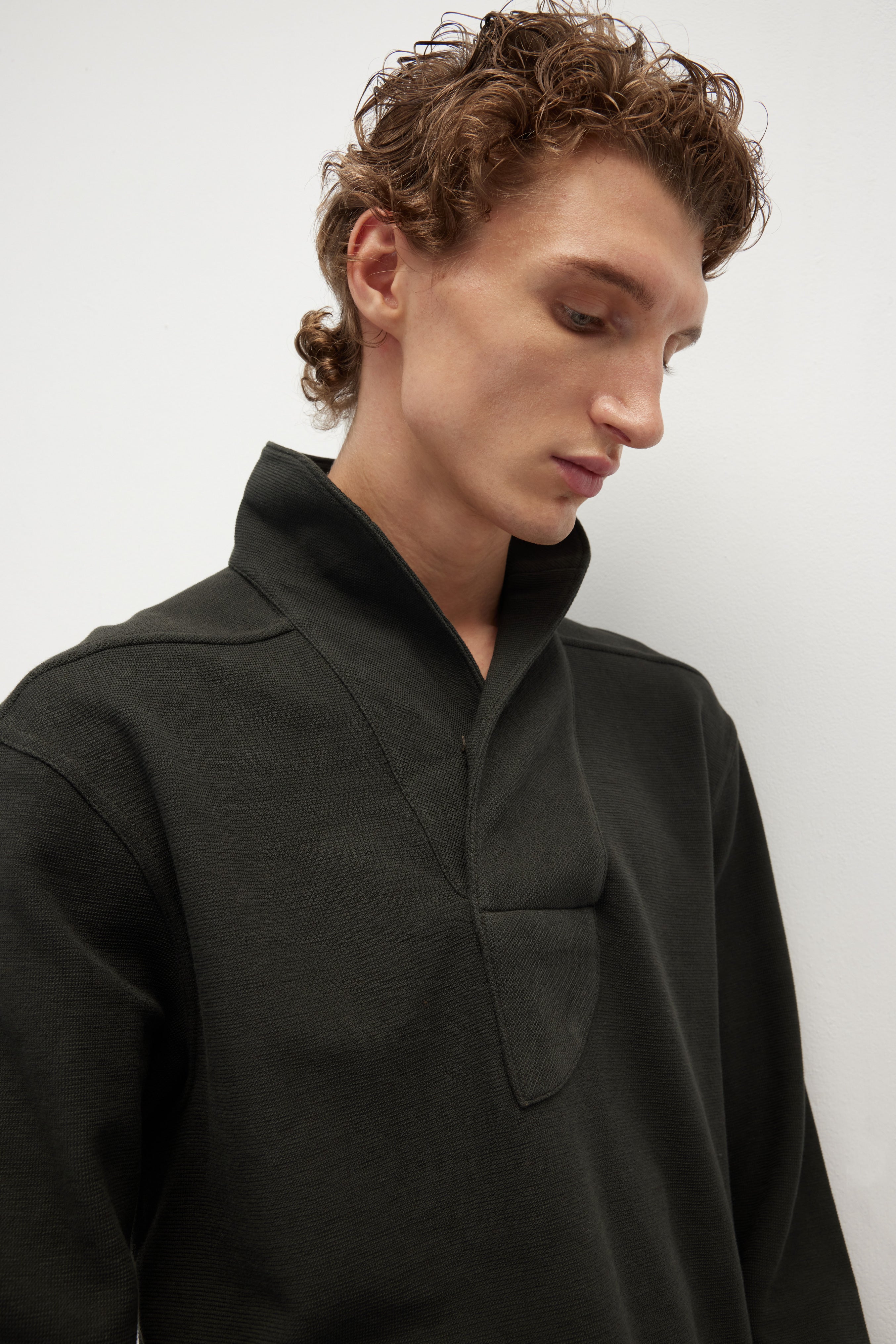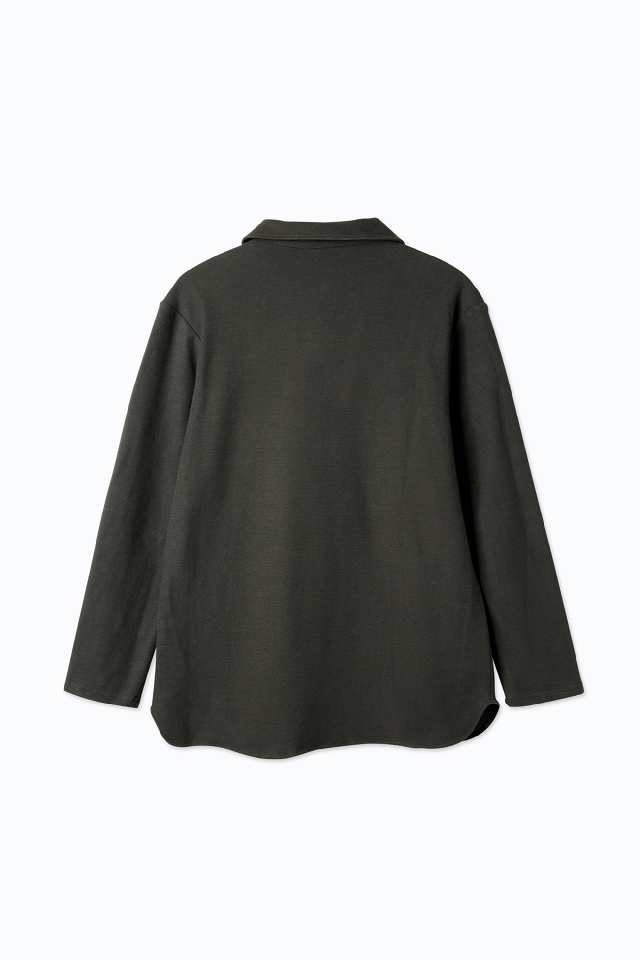 フィット感がありながらもゆったりとしたシルエットの半開襟トップスです。襟元にはオープンカラーを採用し、カジュアルな中にもフォーマルな雰囲気を演出します。また、スタンドカラーとしても着用でき、保温性が向上します。生地には純綿を使用し、立体的な織り模様が施され、自然で快適な肌触りを実現しています。同シリーズのプリーツパンツとのセットアップも可能です。
