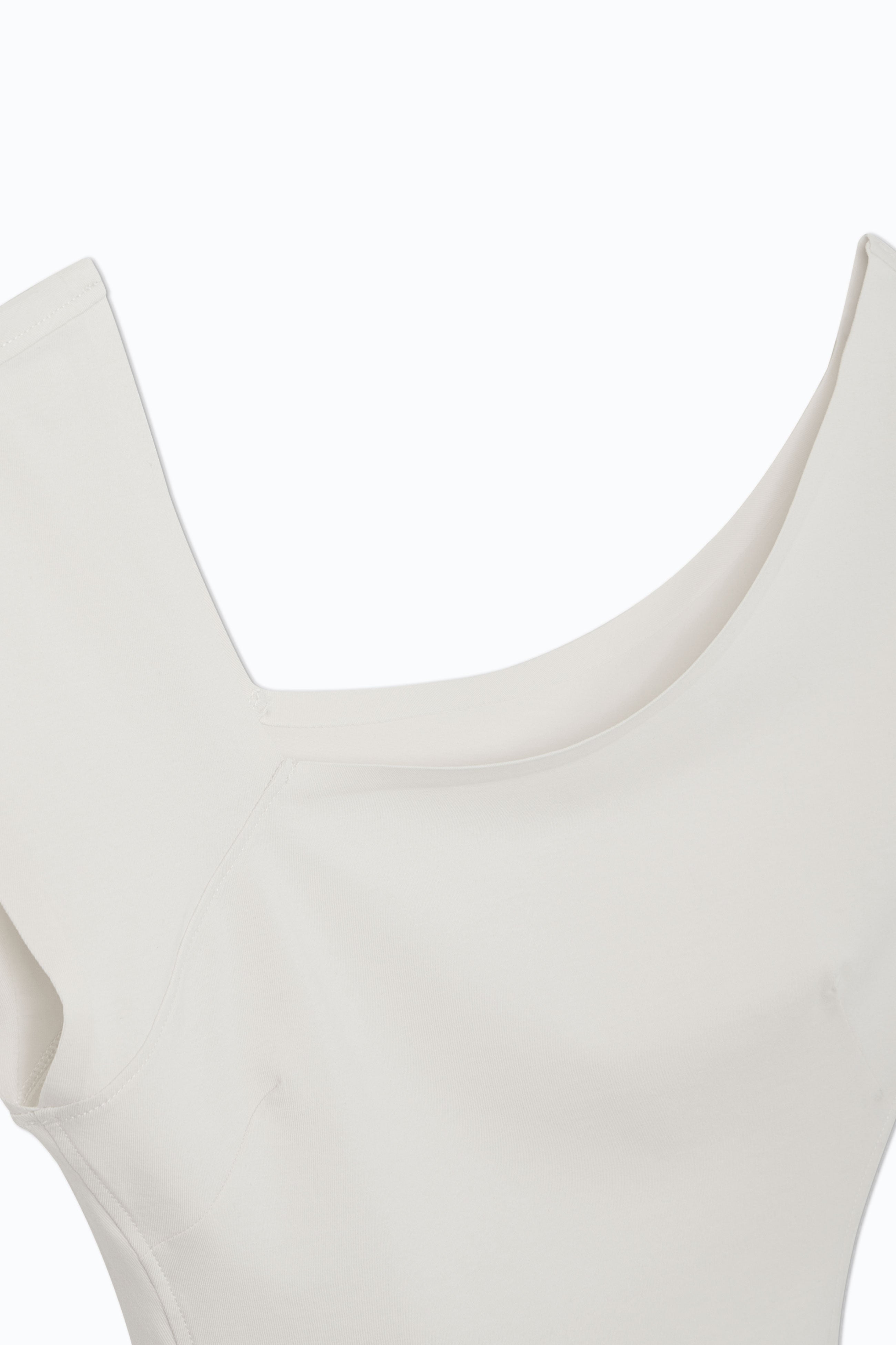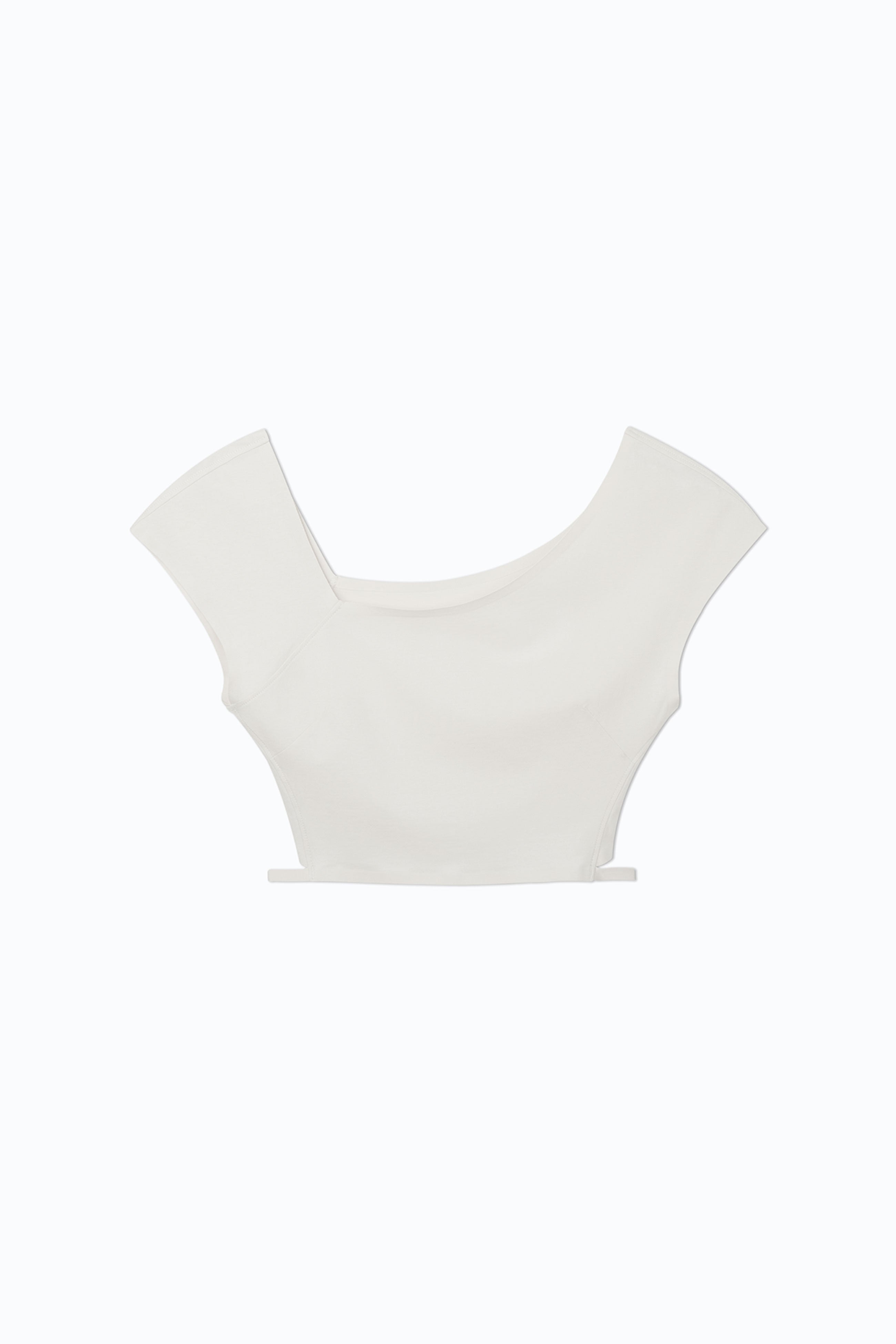 - オフショルダー風のショート丈デザインとウエストディテールの装飾リボンが、さらなるスタイリングのアイデアを加えます。